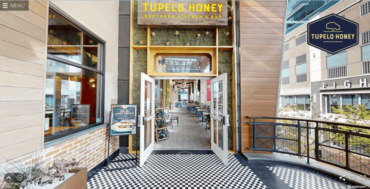 Experience the warm Southern charm of Tupelo Honey in 3D — explore its vibrant atmosphere and inviting interiors before you dine.